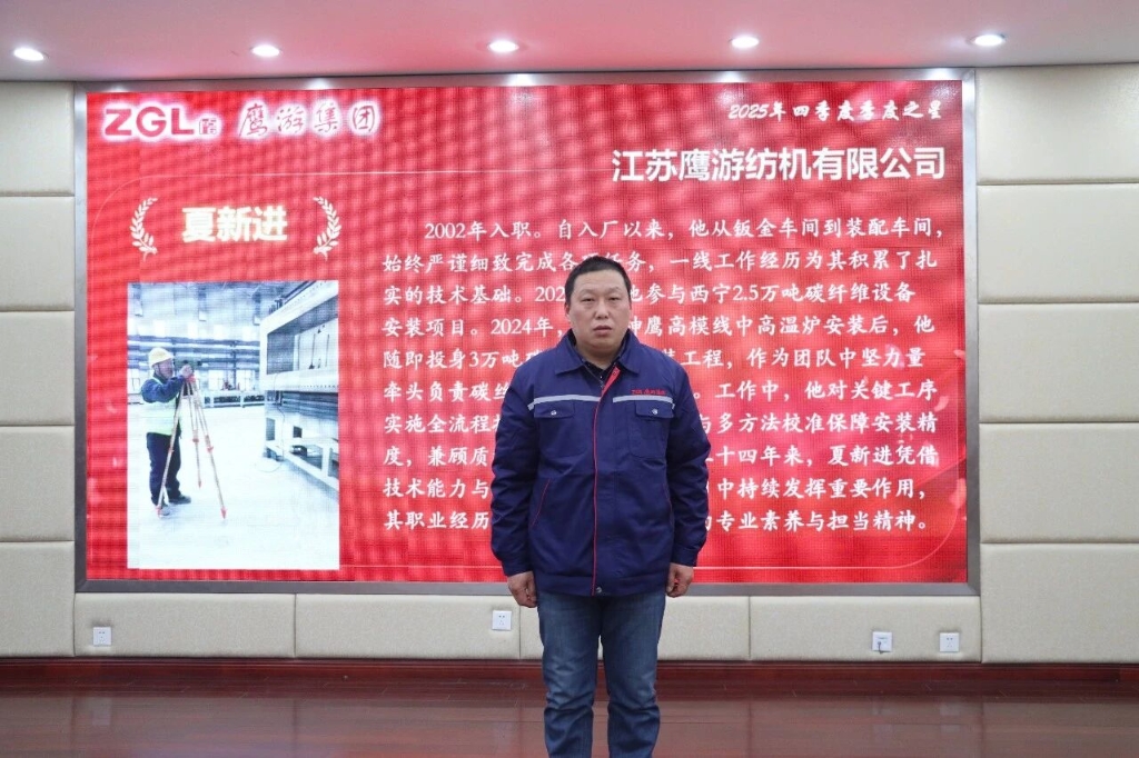 夏新進(jìn),2002年入職江蘇鷹游紡機(jī)公司,現(xiàn)任裝配車間操作工。他先后扎根鈑金、裝配車間一線,積累扎實(shí)技術(shù)功底。2020年,他遠(yuǎn)赴海拔超2500米的高原,參與西寧2.5 萬噸碳纖維設(shè)備安裝項(xiàng)目。2024年完成神鷹高模線中高溫爐安裝后,隨即投身 3萬噸碳纖維設(shè)備工程,牽頭負(fù)責(zé)碳絲車間主體設(shè)備安裝。從業(yè)二十四載,他憑借過硬技術(shù)與責(zé)任擔(dān)當(dāng),在重點(diǎn)項(xiàng)目中彰顯一線技術(shù)人員的專業(yè)素養(yǎng)。